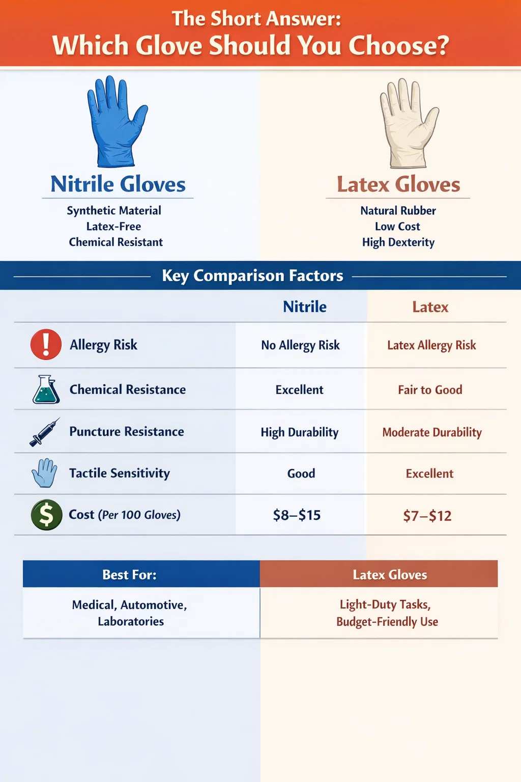 | Cost (per 100 gloves) | $8–$15 | $7–$12 |