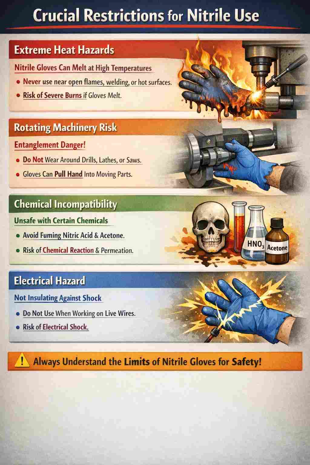 While nitrile gloves are the gold standard for many industries, you should not wear them when working with open flames, handling highly oxidizing acids, or operating rotating power machinery. These gloves are essentially a form of plastic (synthetic rubber); they will melt and fuse to your skin in high-heat scenarios and lack the "breakaway" strength needed to prevent your hand from being pulled into a spinning motor or lathe. Understanding these boundaries is vital for workplace safety.