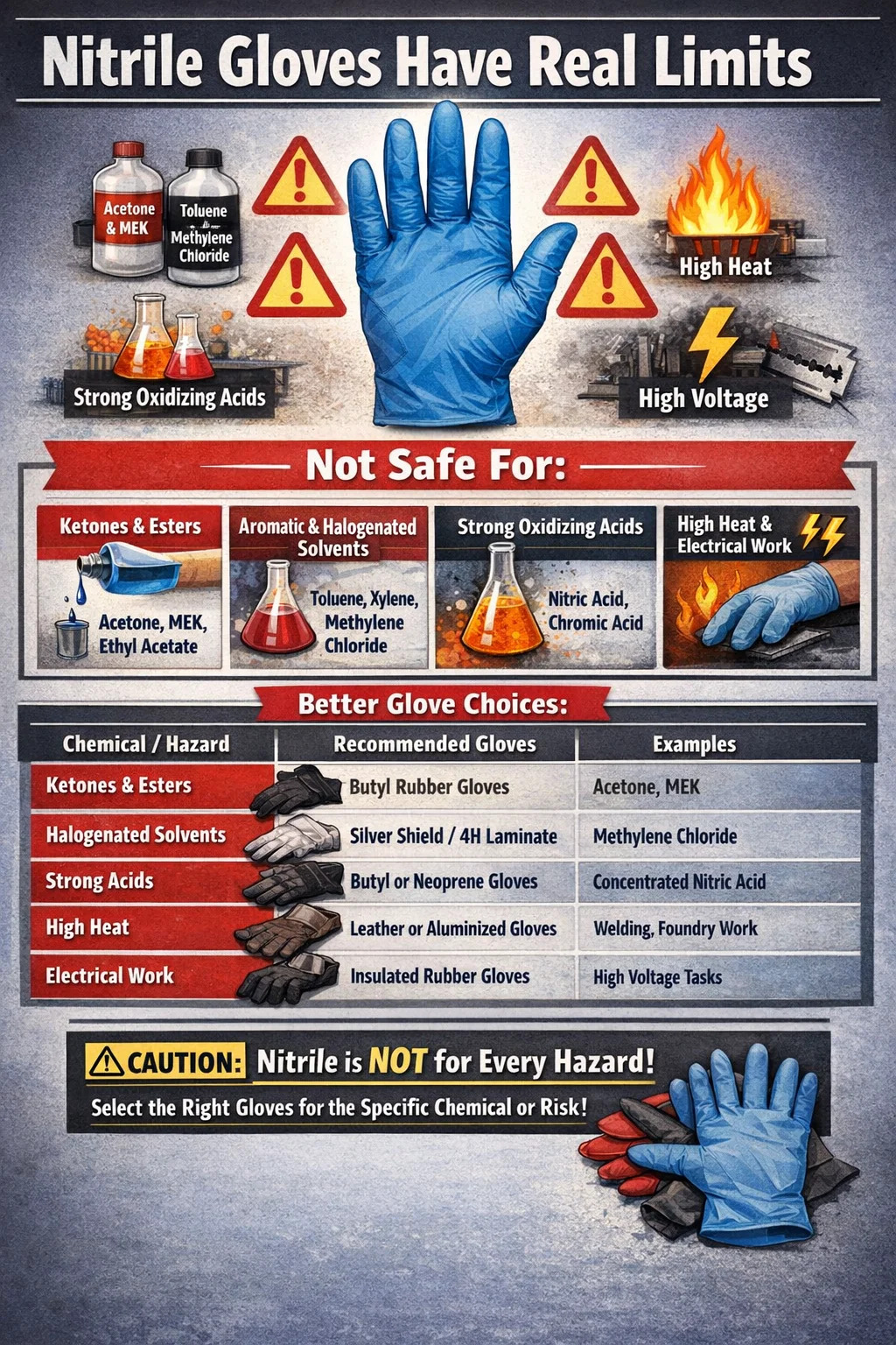 Nitrile gloves are not suitable for use with ketones (like acetone and MEK), certain esters, strong oxidizing acids, and aromatic or halogenated solvents such as toluene, xylene, and methylene chloride. They also fall short in high-heat environments, during electrical work involving high voltage, and in tasks requiring extreme cut or puncture resistance. If you are working with any of these substances or conditions, nitrile is the wrong glove — full stop.